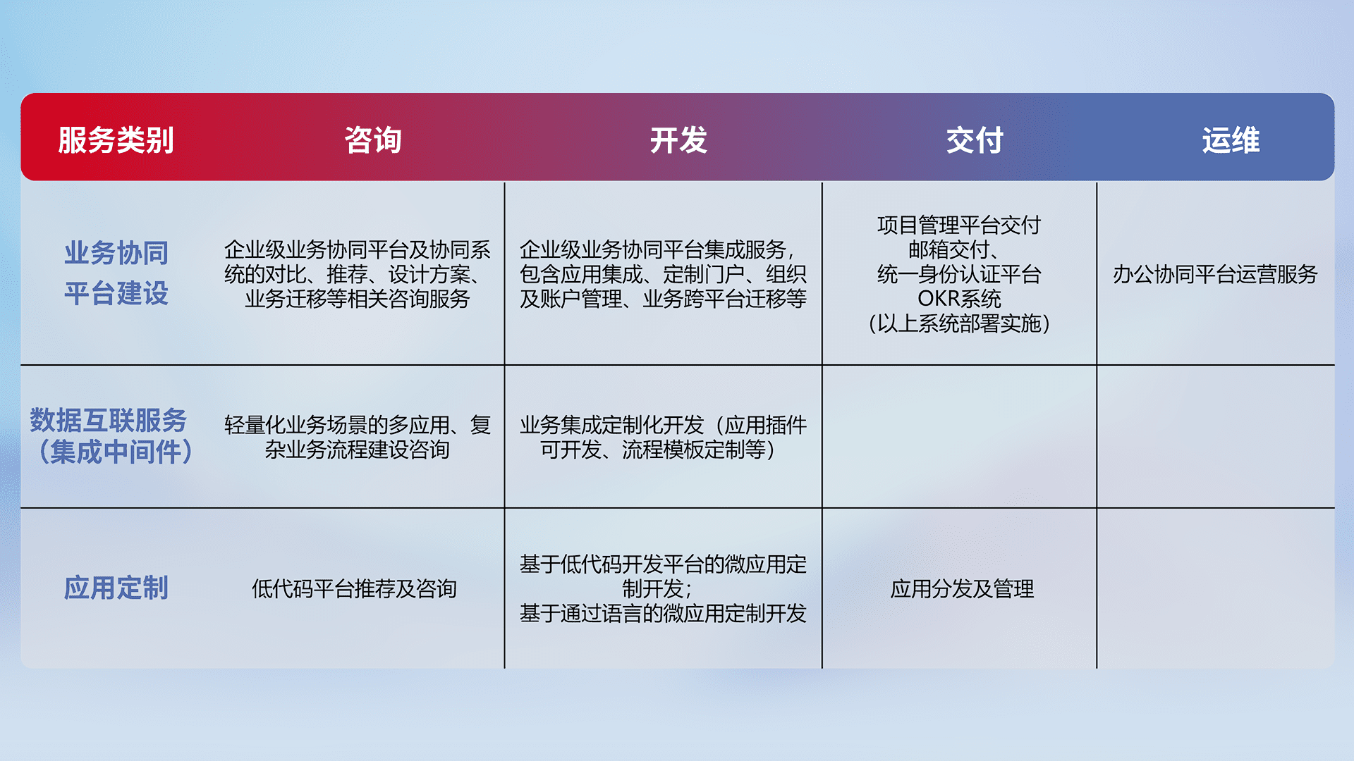 针对钉钉、、、企微、、、IDaas等平台级产品提供产品的规划、、、、方案、、交付、、、、定制化开发等服务,,,实现如统一协同办公、、智能客户服务、、混合会议管理、、、智能数据查询、、、等业务场景,,,实现数字化转型。。。